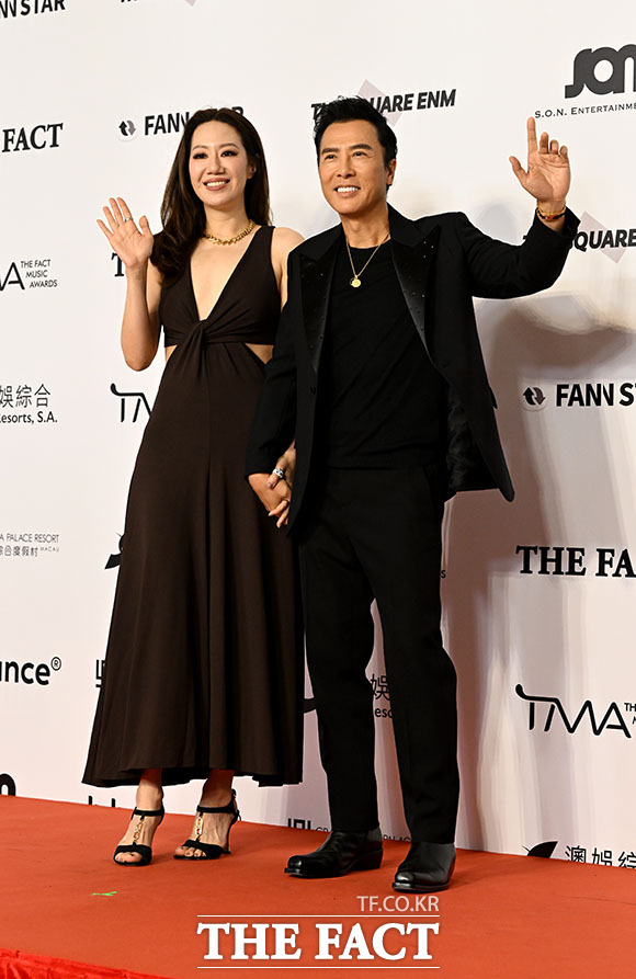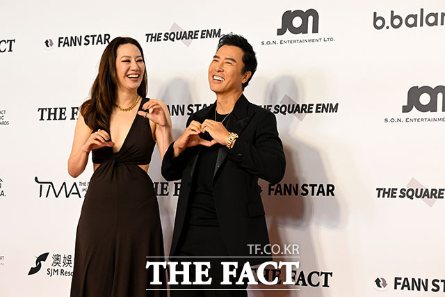 <더팩트>가 주최하고 팬앤스타와 더스퀘어이엔엠이 주관하는 '2025 더팩트 뮤직 어워즈(THE FACT MUSIC AWARDS, TMA)'가 20일 오후 '마카오 아웃도어 퍼포먼스 베뉴'에서 열린 가운데 세계적인 액션배우 겸 감독 견자단(오른쪽)과 아내 씨실리아 웡(Cecilia wang)이 레드카펫을 밟고 있다. /배정한 기자